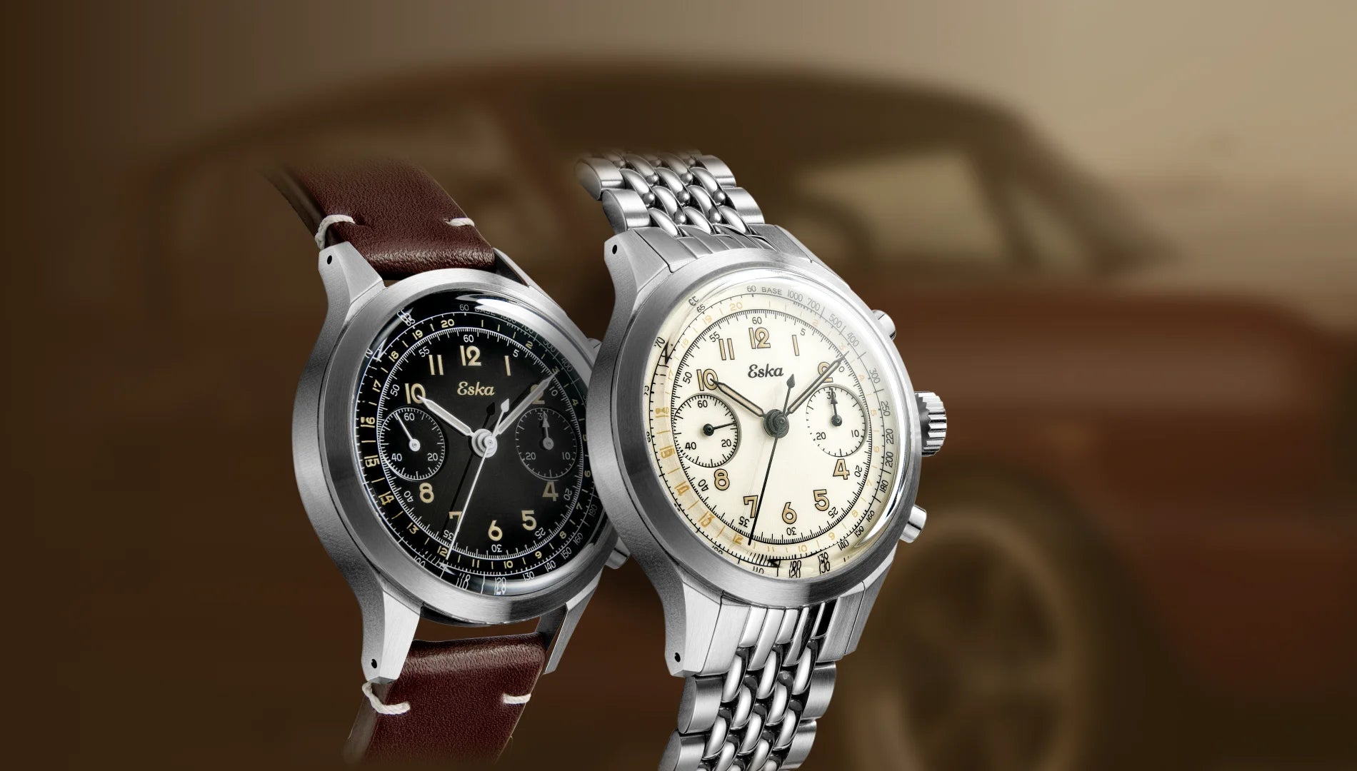 Le boîtier de l’ESKA Watches Heritage affiche une personnalité marquée, puisant son inspiration directement dans un modèle de chronographe Eska d’époque, tout en affirmant une présence contemporaine.
