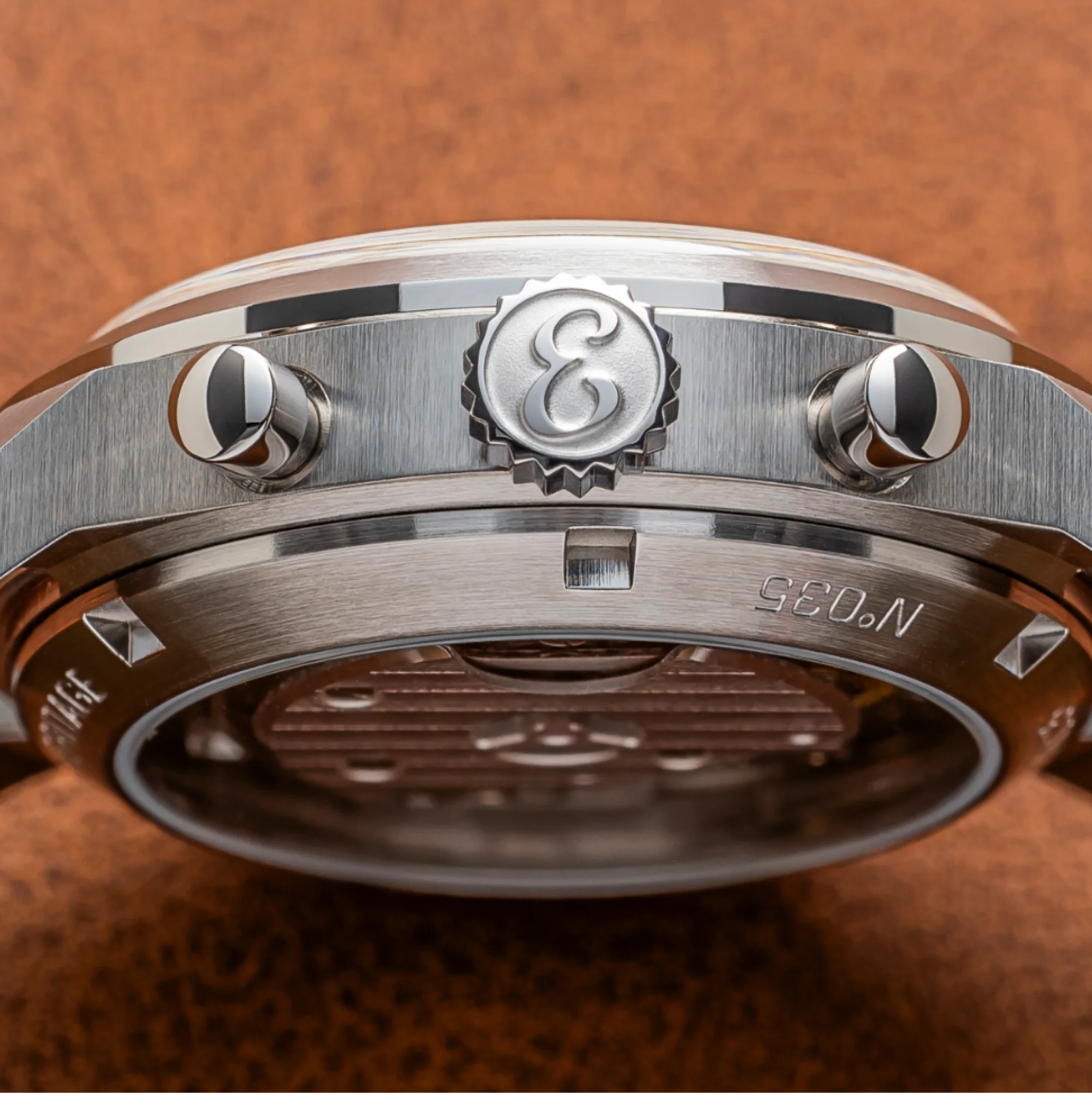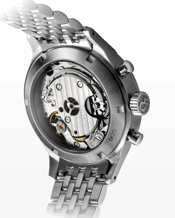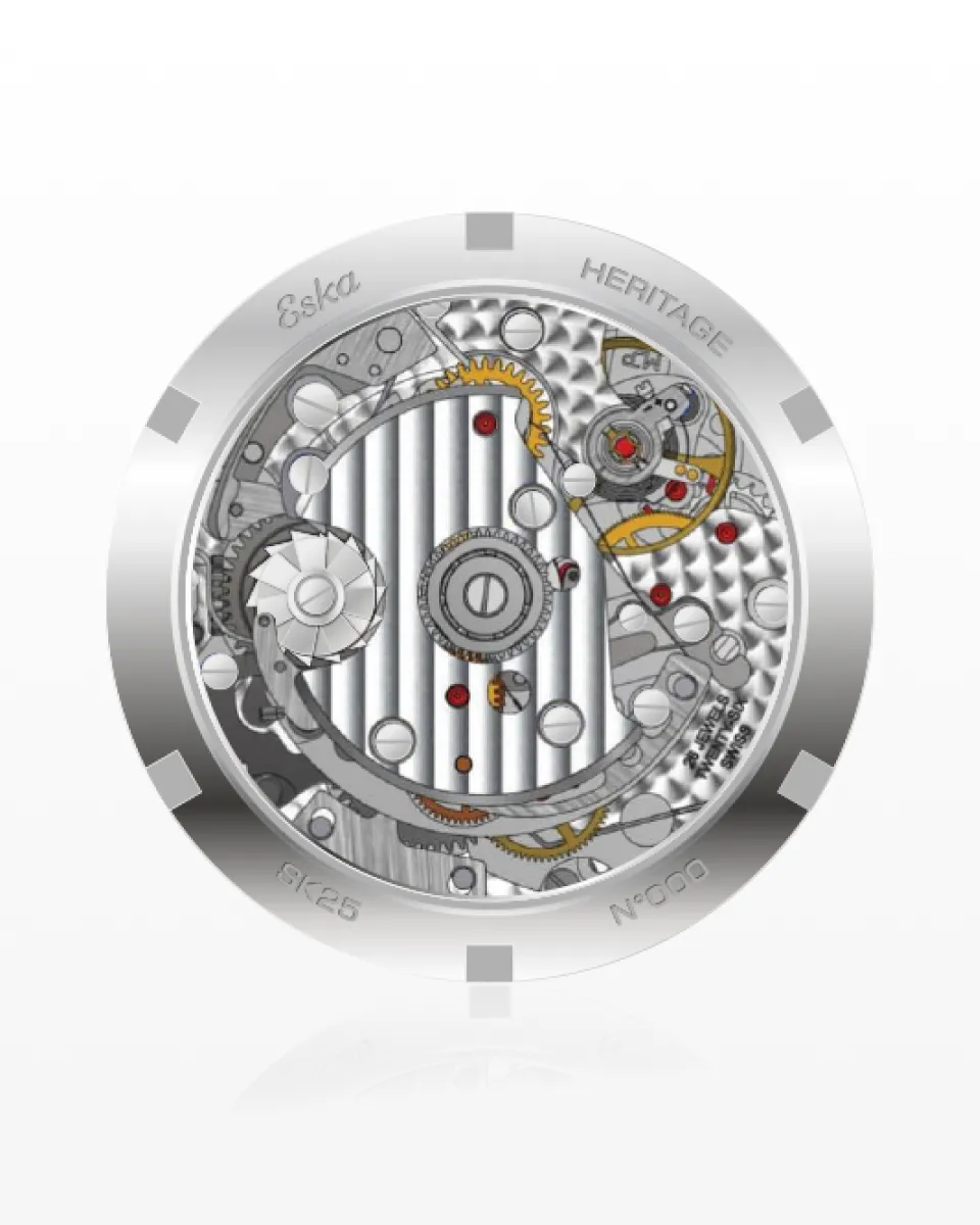 La couronne, surdimensionnée et crantée, porte fièrement le logo ESKA Watches appliqué, clin d’œil assumé à l’histoire centenaire de la marque. Enfin, le nouveau fond ouvert en saphir dévoile sans retenue les battements du mouvement, invitant le regard à plonger au cœur de la belle mécanique.