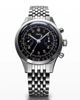 Les cornes percées, sculptées avec précision et inclinées à 45 degrés, assurent un ajustement et un confort parfaits au poignet, tandis que les poussoirs ronds classiques rappellent les instruments de mesure des tableaux de bord automobiles.