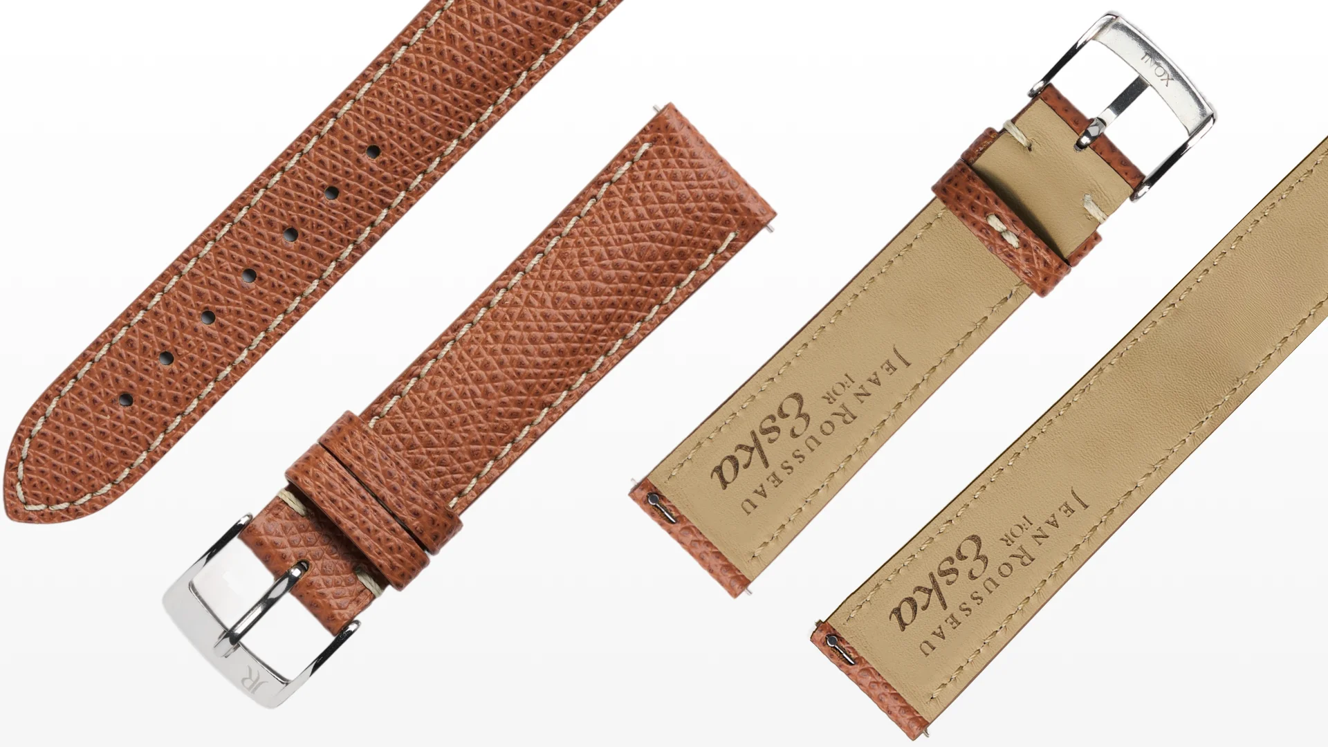 - Un bracelet en cuir de veau grainé marron, réalisé en collaboration avec Jean Rousseau, avec doublure siglée Eska, boucle ardillon et pompes rapides pour un changement facile sans outil.
