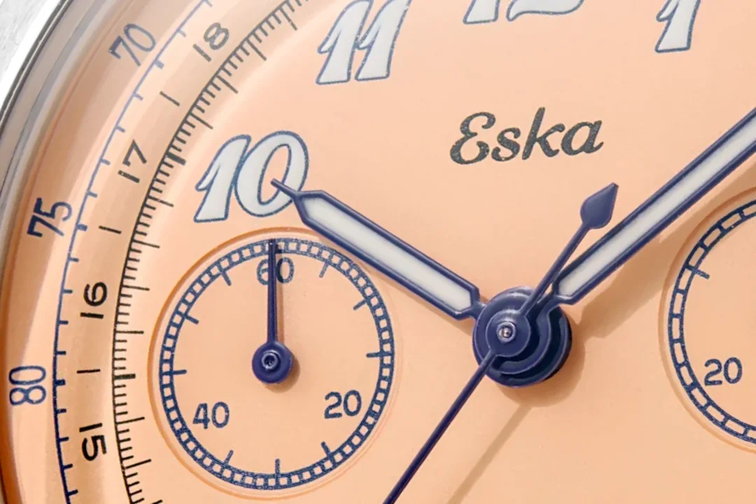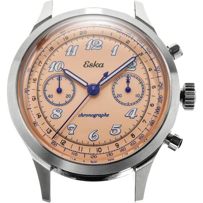 Le Eska Chronographe Racing Sunset propose une esthétique audacieuse et distincte. Il est doté d’un cadran mat de couleur saumon. Les chemins de fer bleus contrastent subtilement avec le cadran, tandis que l’aiguille du chronographe est également de couleur bleue.